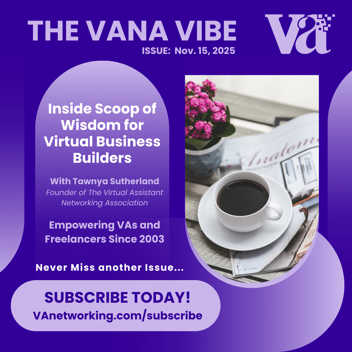The VANA Vibe Newsletter is your go-to inbox boost for staying in the know with what’s actually working right now for Virtual Assistants, Freelancers, and Digital Service Pros. From client-getting strategies and business-building tips to subscriber-only discounts and new training drops—we’ve got your back.