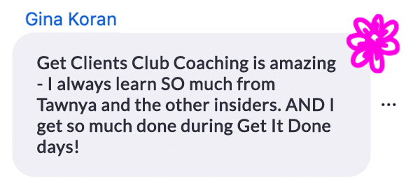 Tawnya’s group coaching, training modules, and community are positive, uplifting, and practical. I am learning the hands-on skills for how to build my business and grow my client list, along with the support I need to make it happen. My questions are answered in detail with a quick turnaround. The coaching group members really support each other. If you are feeling isolated and alone in your business, check out the Get Clients Club!