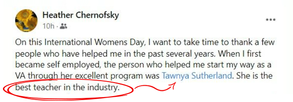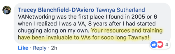 Tawnya’s Virtual Assistant Career training course will lead you through every aspect of what you need to do to get started and be successful… and I have a great client roster. I couldn’t have done it without this program.